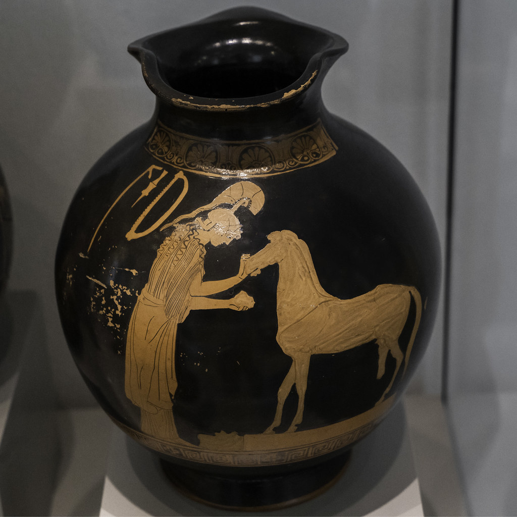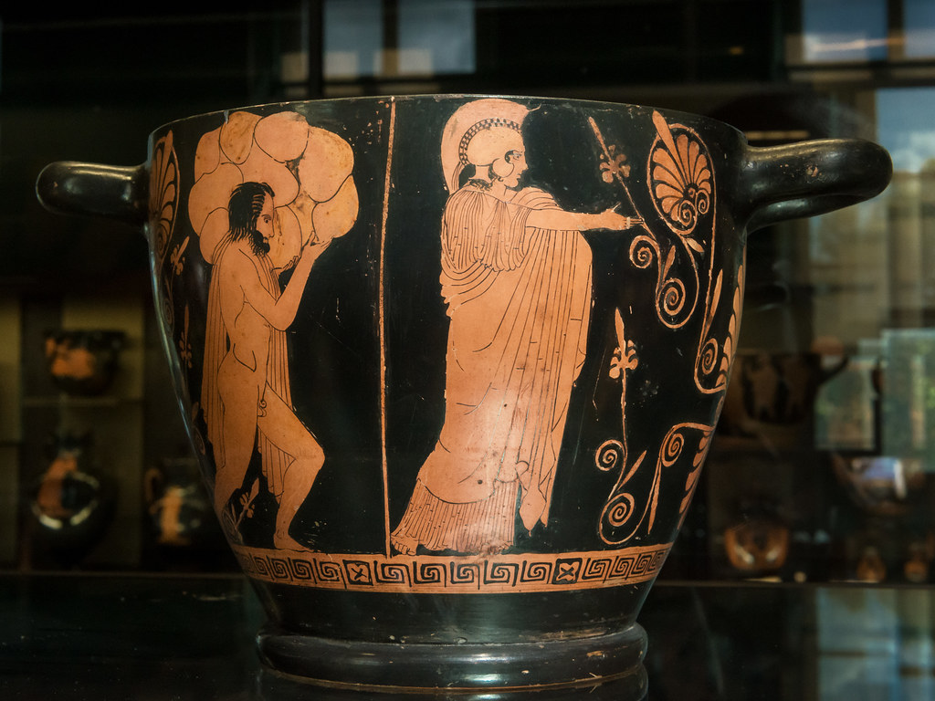 24. [3] πολλὰ δ᾽ ἄν τις ἐθέλων εἰκάζοι. λέλεκται δέ μοι καὶ πρότερον ὡς Ἀθηναίοις περισσότερόν τι ἢ τοῖς ἄλλοις ἐς τὰ θεῖά ἐστι σπουδῆς· πρῶτοι μὲν γὰρ Ἀθηνᾶν ἐπωνόμασαν Ἐργάνην, πρῶτοι δ᾽ ἀκώλους Ἑρμᾶς <ἀνέθεσαν>, ὁμοῦ δέ σφισιν ἐν τῷ ναῷ † σπουδαίων δαίμων ἐστίν. ὅστις δὲ τὰ σὺν τέχνῃ πεποιημένα ἐπίπροσθε τίθεται τῶν ἐς ἀρχαιότητα ἡκόντων, καὶ τάδε ἔστιν οἱ θεάσασθαι. κράνος ἐστὶν ἐπικείμενος ἀνὴρ Κλεοίτου, καί οἱ τοὺς ὄνυχας ἀργυροῦς ἐνεποίησεν ὁ Κλεοίτας· ἔστι δὲ καὶ Γῆς ἄγαλμα ἱκετευούσης ὗσαί οἱ τὸν Δία, εἴτε αὐτοῖς ὄμβρου δεῆσαν Ἀθηναίοις εἴτε καὶ τοῖς πᾶσιν Ἕλλησι συμβὰς αὐχμός. ἐνταῦθα καὶ Τιμόθεος ὁ Κόνωνος καὶ αὐτὸς κεῖται Κόνων· Πρόκνην δὲ τὰ ἐς τὸν παῖδα βεβουλευμένην αὐτήν τε καὶ τὸν Ἴτυν ἀνέθηκεν Ἀλκαμένης. πεποίηται δὲ καὶ τὸ φυτὸν τῆς ἐλαίας Ἀθηνᾶ καὶ κῦμα ἀναφαίνων Ποσειδῶν·